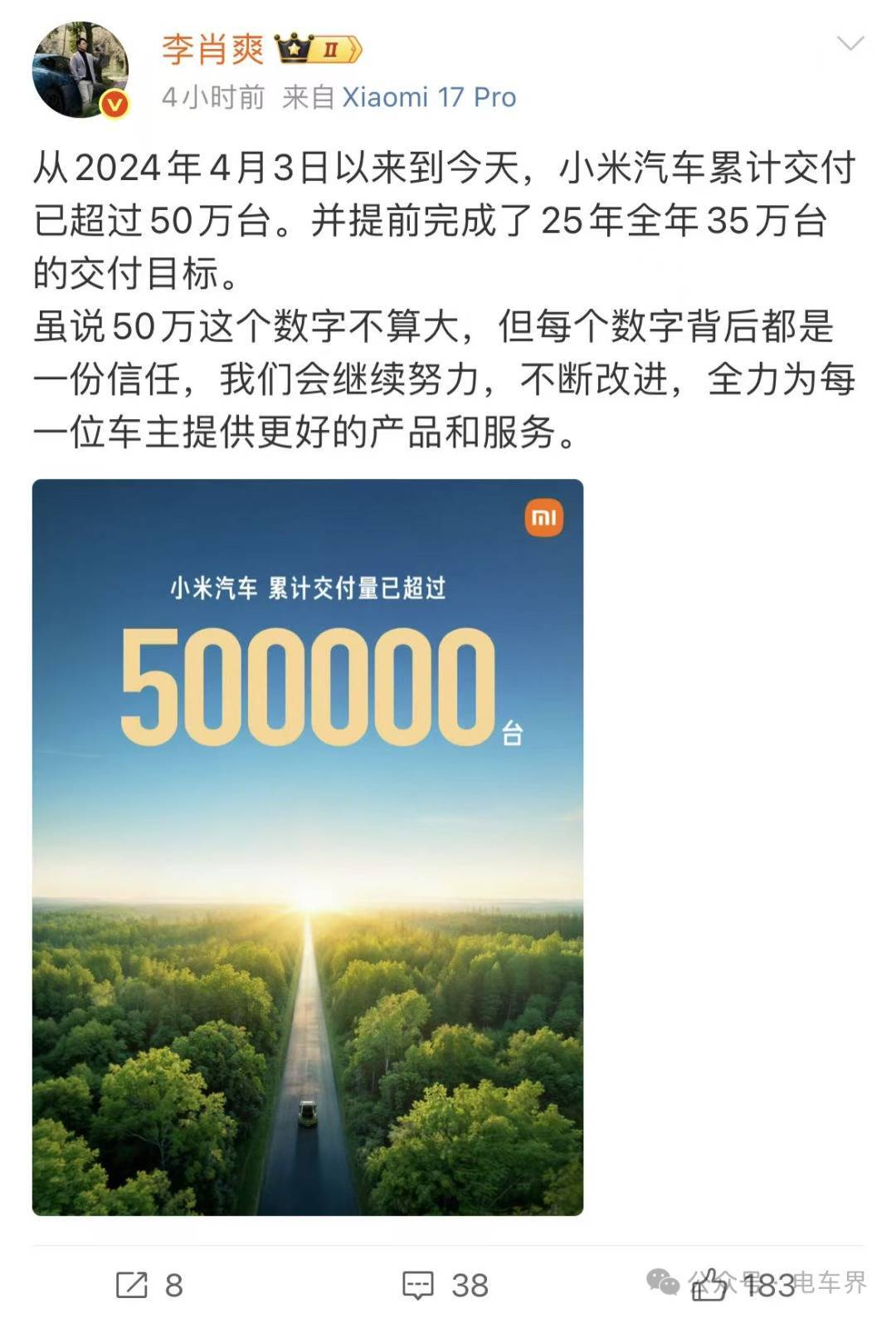 小米汽车副总裁李肖爽表示:“虽说50万这个数字不算大,但每个数字背后都是一份信任,我们会继续努力,不断改进,全力为每一位车主提供更好的产品和服务。 ”