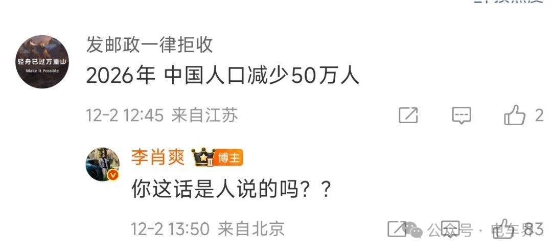 有网友在李肖爽微博评论区发布恶意评论:“2026年 中国人口减少50万人。”