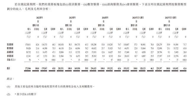 根据招股书,2022年~2024年,公司的营业收入从2.73亿元增长至2.94亿元,同比依次增长3.9%与3.8%,增速较为平缓。2025年前八个月收入为2.29亿元,同比增速达到18.77%,这得益于数智服务及会展服务的拉动,但只占2024年全年收入的77.9%。