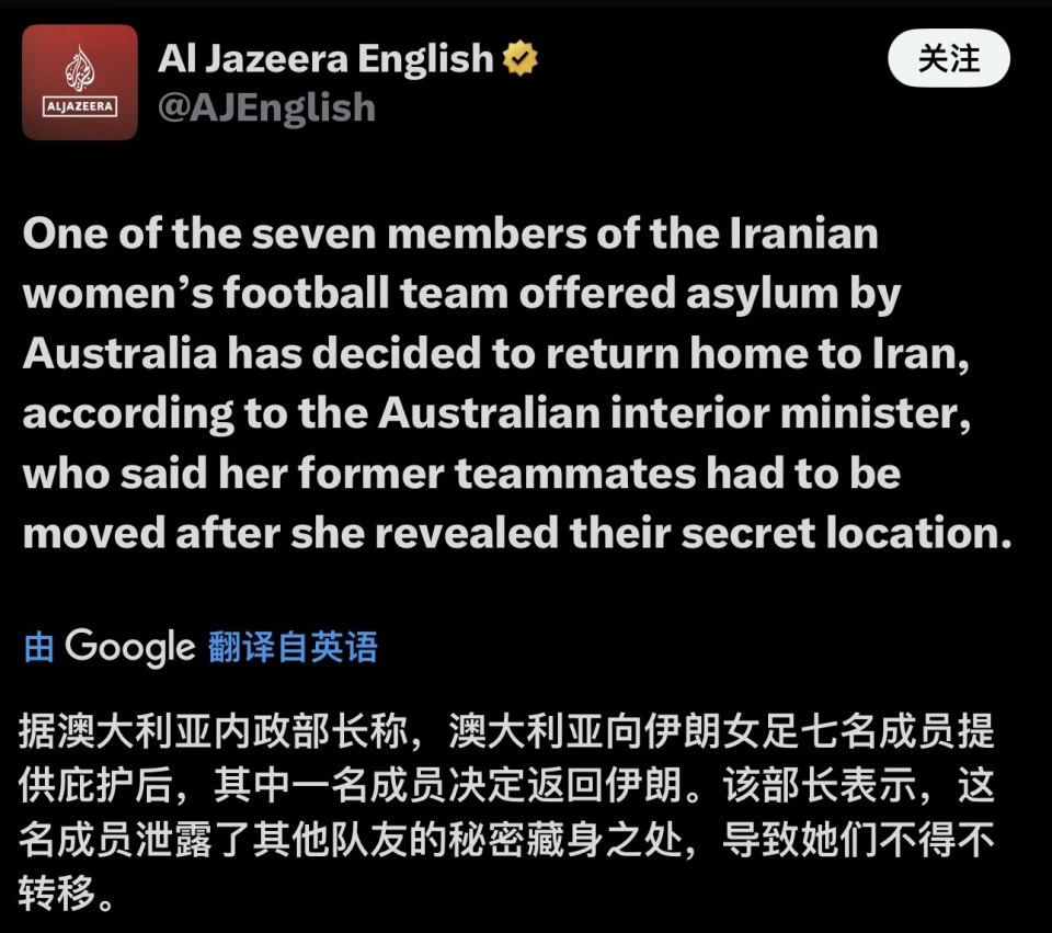 很多球迷还没理清脉络,我用最通俗的话给大家拆解:伊朗女足亚洲杯出局后,球队分裂成两拨——7人留在澳洲申请庇护,剩下的队员按原计划返程,准备经吉隆坡转机土耳其,最终返回伊朗。可谁也没想到,刚到吉隆坡,就被“按”在酒店里,走不了、联系不上、未来不明。
